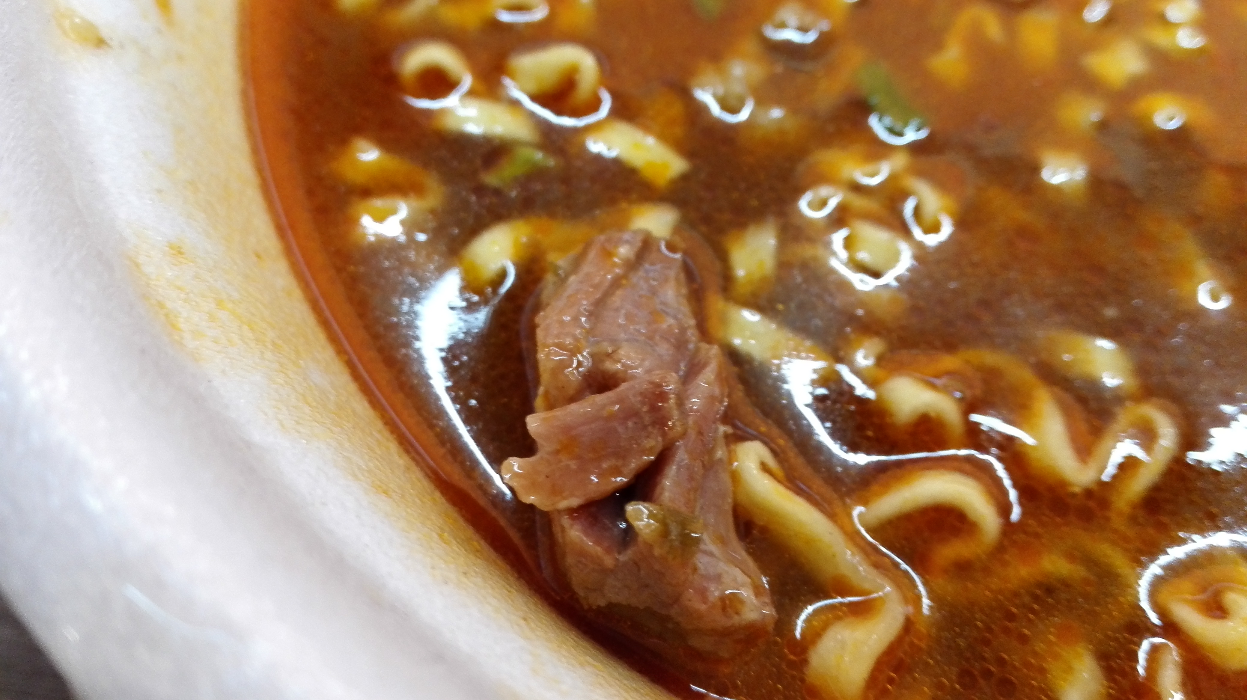 汤底:很稀,但真的很辣,就是纯粹的刺激喉咙的辣,基本没有麻的成分。喝一一两口不想喝了。